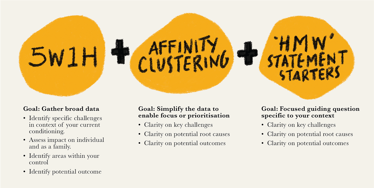 Read about the tools mentioned here: 5W1H, Affinity Clustering, and “How Might We” Statement Starters.